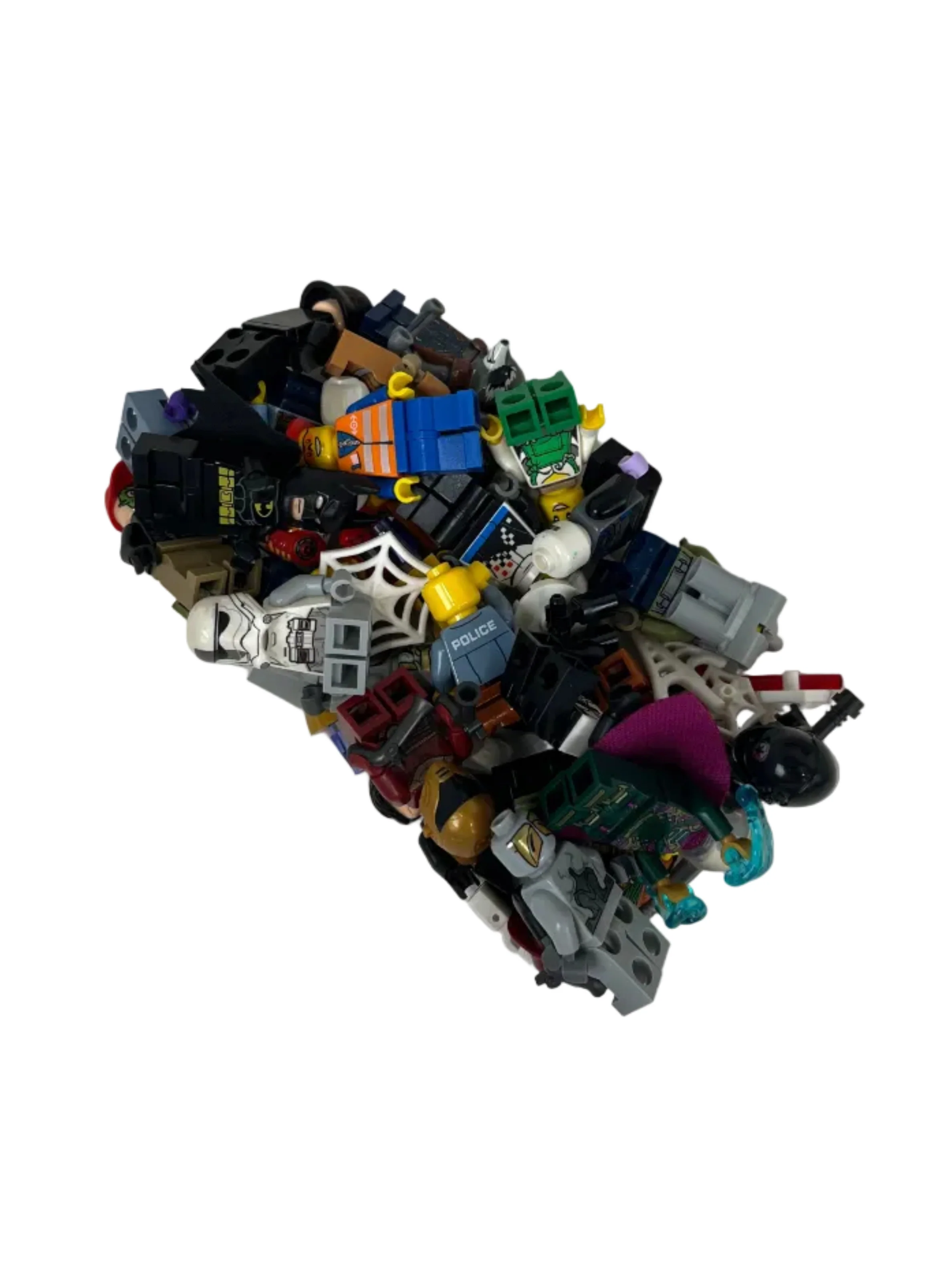 Large box of Lego with Star Wars and Marvel action figures.